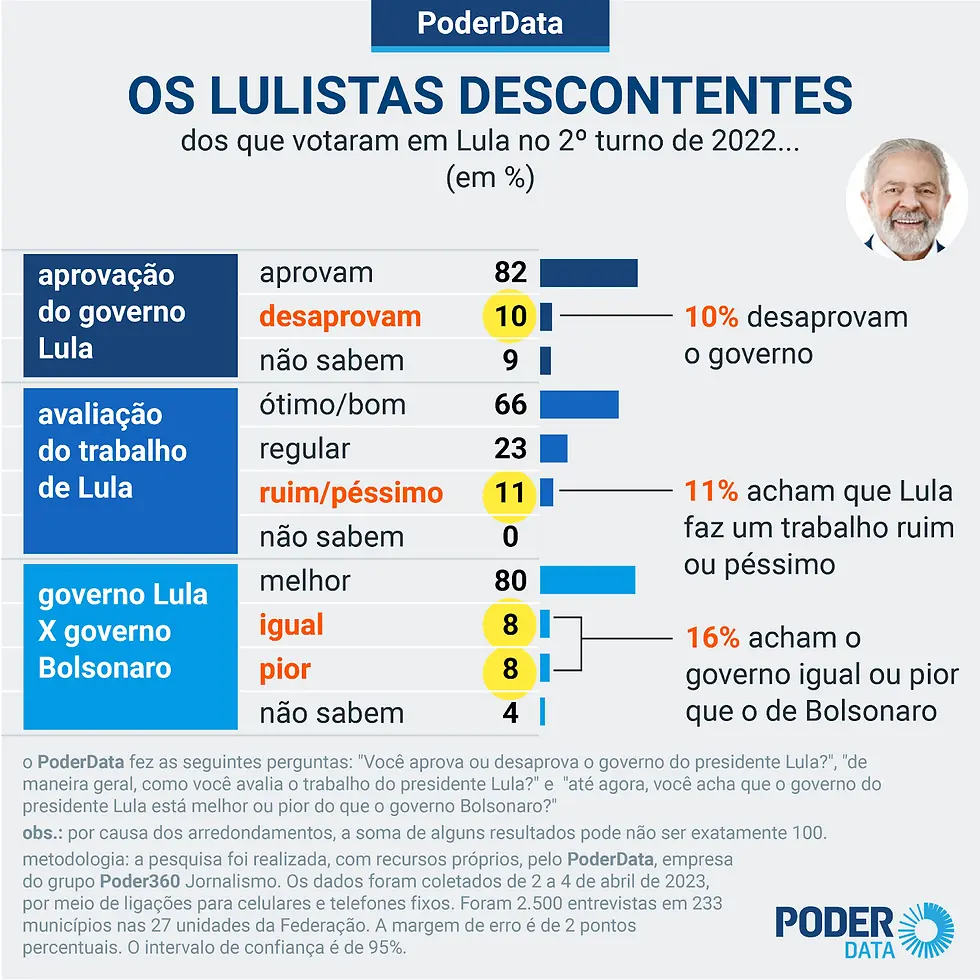 Pesquisa PoderData realizada de 12 a 14 de abril de 2021 (veja a íntegra) mostra que o governo do ex-presidente Luiz Inácio Lula da Silva é desaprovado por 10% dos eleitores que o escolheram em 2006, quando ele se reelegeu.